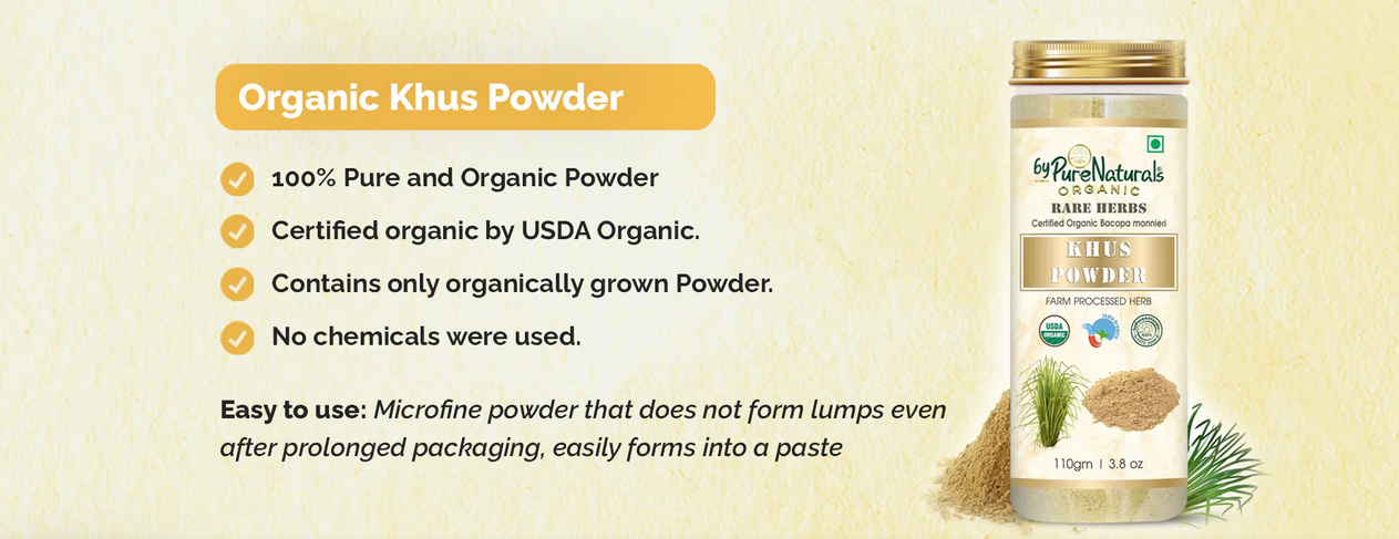Experience the calming, purifying power of byPureNaturals 100% Organic Khus Powder, made from sun-dried and finely ground Vetiver roots. Known for its cooling, anti-inflammatory, and aromatic properties, Khus (Vetiver) is ideal for both skin and hair care rituals.